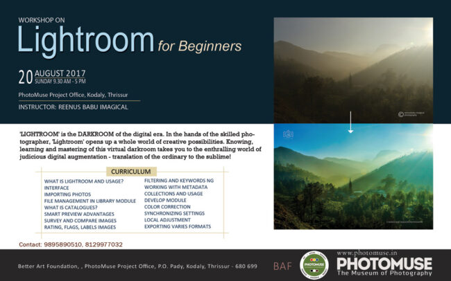 Light PhotoMuse invites you to the one day workshop of “LIGHTROOM’, by REENUS BABU IMAGICAL Please call at: 9895890510, 8129977032 Seats are VERY limited this time. Please confirm your availability at the earliest. VenuePhotoMuse Gallery, Kodaly, ThrissurDate2017 August 20EntryDonation from participants