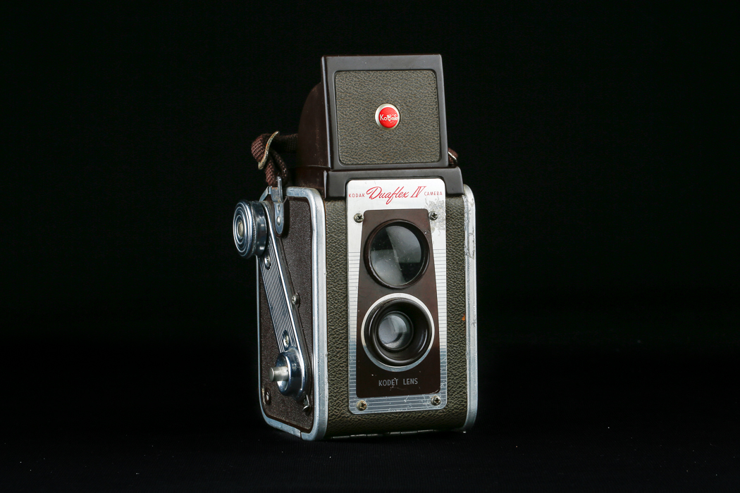 The Kodak Duaflex is a 620 roll film pseudo TLR made by Kodak in the US and UK (Year: 1955-1960). A pseudo-TLR is a camera that imitates the look of a TLR (twin lens reflex). It is simply a large reflecting type viewfinder. Duaflex IV is modified to accept the Kodalite flash holder. It had an aluminum-alloy body and a simple fixed focus 75 mm f/15 Kodet lens.