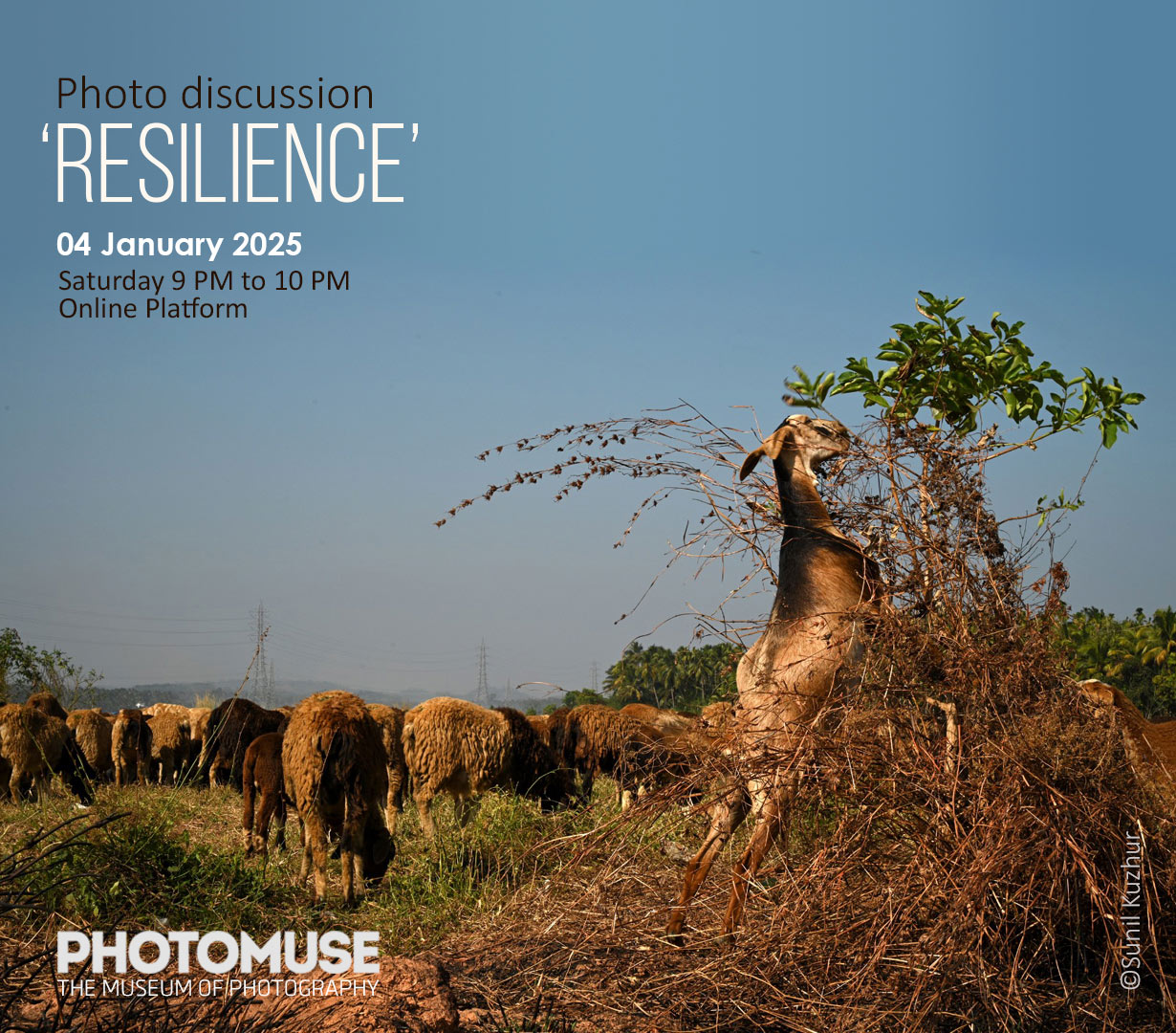 PhotoMuse museum presents an online discussion based on photographs interpreting the idea of ‘Resilience’. Date: 2025 January 4 Time: 09 PM to 10 PM Post navigationPreviousPrevious post:Bird Photography Camp: Keoladeo National Park, BharatpurNextNext post:DIVERSE LIFE: Exhibition of Nature Photographs from Kerala by Dr. Lutz Gabriel, GermanyRelated posts‘Kodaly – A visual chronicle of place and people’November 1, 2025Sri. Vijayakumar Menon Memorial DayNovember 1, 2025PhotoMuse Members’ Day 2025October 21, 2025Video editing & colouring for photographersOctober 21, 2025Technology as the photographer’s brushOctober 9, 2025Quest_edition 25September 26, 2025