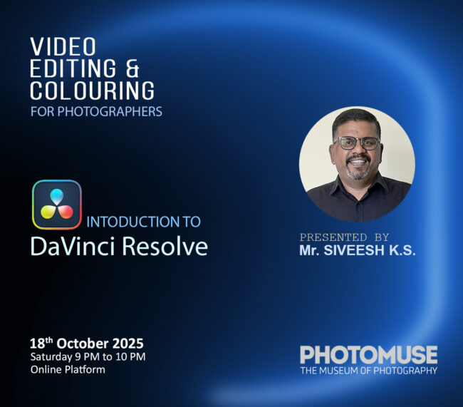 ‘Video editing & colouring for photographers’ Introduction to DaVinci Resolve The topic Presented by Mr. Siveesh K.S. Date: 2025 October 18 Venue: Online Time: 09 PM to 10 PM