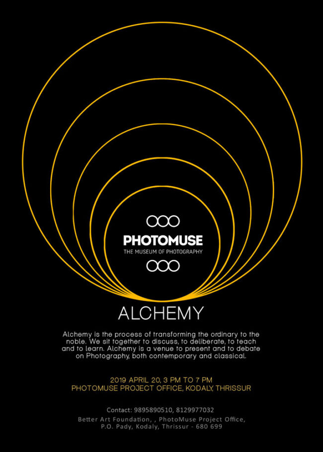 Alchemy is the process of transforming the ordinary to the noble. We sit together to discuss, to deliberate, to teach and to learn. Alchemy is a venue to present and to debate on Photography, both contemporary and classical. Please call at: 8129977032, 9745258575, 9895890510 VenuePhotoMuse Gallery, Kodaly, ThrissurDate2019 April 20EntryFree