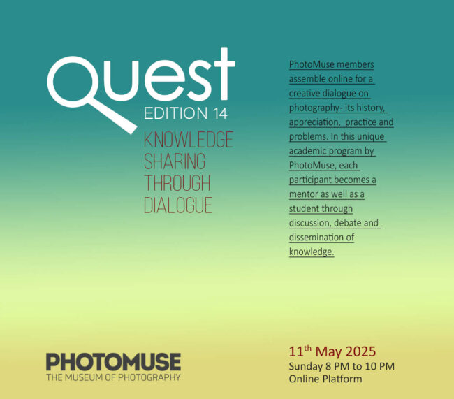 PhotoMuse members assemble online for a creative dialogue on photography – its history, appreciation, practice and problems. In this unique academic program by PhotoMuse, each participant becomes a mentor as well as a student through discussion, debate and dissemination of knowledge. Date: 2025 May 11 Time: 08 PM to 10 PM