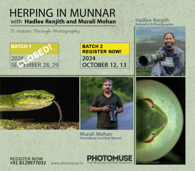 Herping in Munnar with Hadlee Renjith and Murali Mohan PhotoMuse is organising a program “Herping in Munnar” with Hadlee Renjith and Murali Mohan. Herping is an organized or guided activity of searching for amphibians or reptiles in the deep rainforest. Munnar is an ideal place for herping and macro photography during monsoons in Kerala. Mentor:…