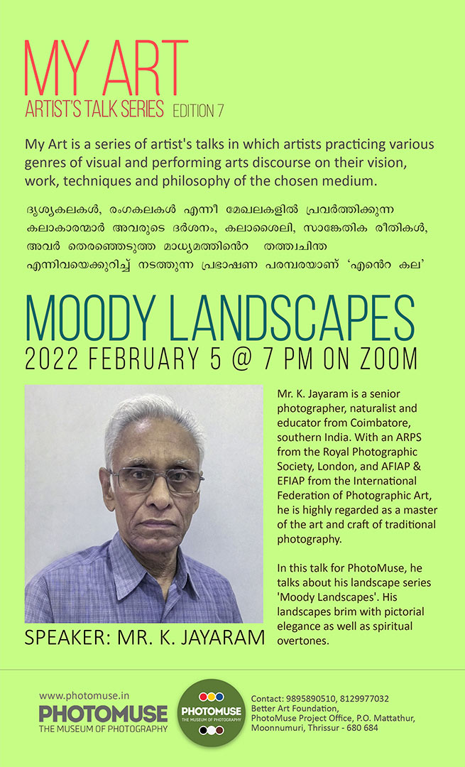 Mr. K. Jayaram is a senior photographer, naturalist and educator from Coimbatore, southern India. With an ARPS from the Royal Photographic Society, London, and AFIAP & EFIAP from the International Federation of Photographic Art, he is highly regarded as a master of the art and craft of traditional photography.