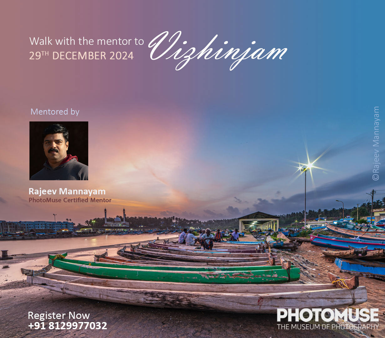 Walk with mentor: Vizhinjam Mentor: Rajeev Mannayam Date: 29-12-2024 Place: Vizhinjam For registration: 8129977032 Post navigationPreviousPrevious post:Photo Discussion: ‘Beginning’NextNext post:Wildlife photography camp at BandipurRelated postsExploring wildlife photography in the heart of ParambikulamJanuary 7, 2026PhotoMuse Festival of Photography- Result AnnouncementJanuary 1, 2026Rajagopal Menon Memorial Scholarship 2025December 24, 2025Hampi: Monument Photography CampDecember 19, 2025Varanasi: An Open Book of Unending StoriesDecember 4, 2025Photo Discussion: ‘Transition’November 21, 2025