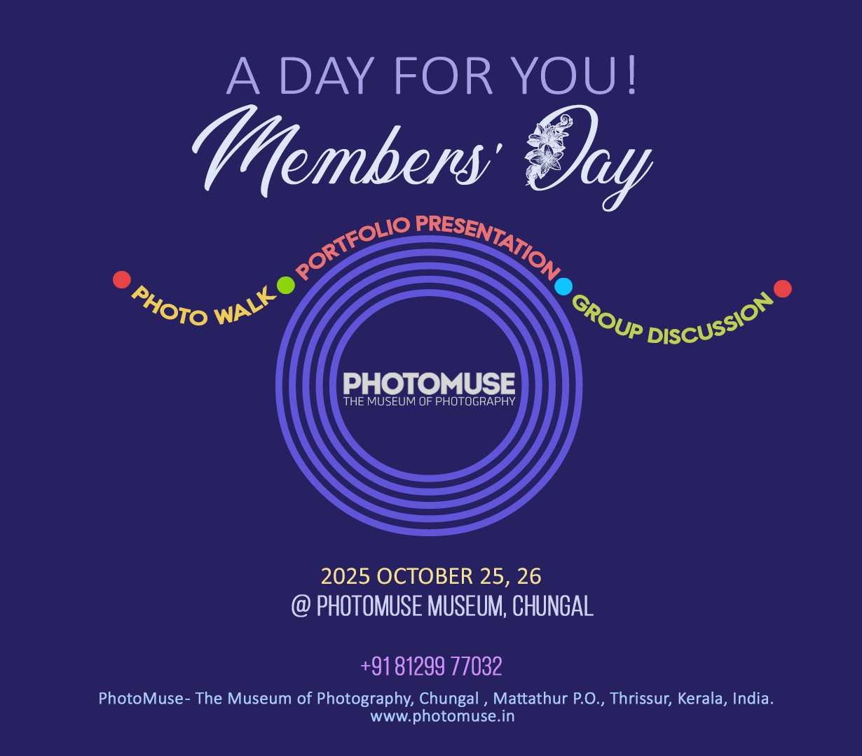 PhotoMuse Members’ Day 2025 October 25,26 At PhotoMuse Museum, Chungal, Thrissur Post navigationPreviousPrevious post:Video editing & colouring for photographersNextNext post:Sri. Vijayakumar Menon Memorial DayRelated postsJawai Rajasthan ‘The Leopard Hills’November 11, 2025Mastering the camera – Online seriesNovember 11, 2025കവിതയുടെ അടിത്തട്ടിലെ ദൃശ്യാനുഭവങ്ങളും കാഴ്ചയുടെ അടിത്തട്ടിലെ കാവ്യാനുഭവങ്ങളും – ചില ചിന്തകൾNovember 6, 2025‘Kodaly – A visual chronicle of place and people’November 1, 2025Sri. Vijayakumar Menon Memorial DayNovember 1, 2025Video editing & colouring for photographersOctober 21, 2025