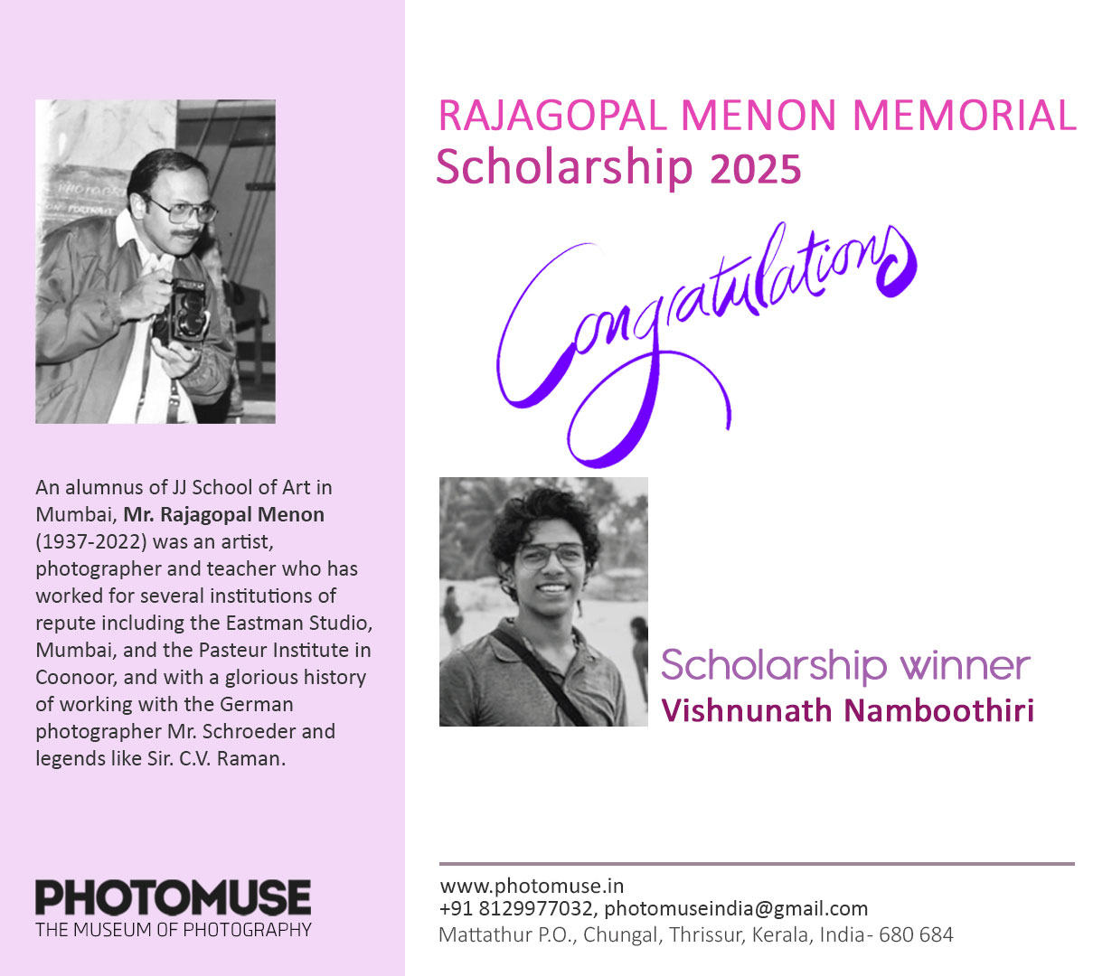 The Rajagopal Menon Memorial Scholarship, supported by the family of the late Mr. Rajagopal Menon (1937-2022), is designed to nurture the next generation of visual storytellers. This scholarship will support Vishnunath through a year-long journey of artistic growth, providing access to five academic programs, workshops, and camps organized by PhotoMuse.